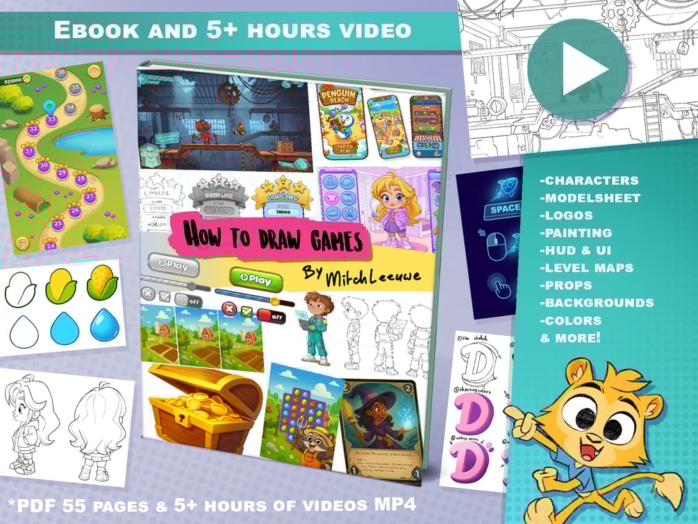 Unlock a complete 55-page eBook + 5 hours of video lessons that teach kids, beginners, and aspiring game artists how to draw for games in a fun, simple, and practical way.