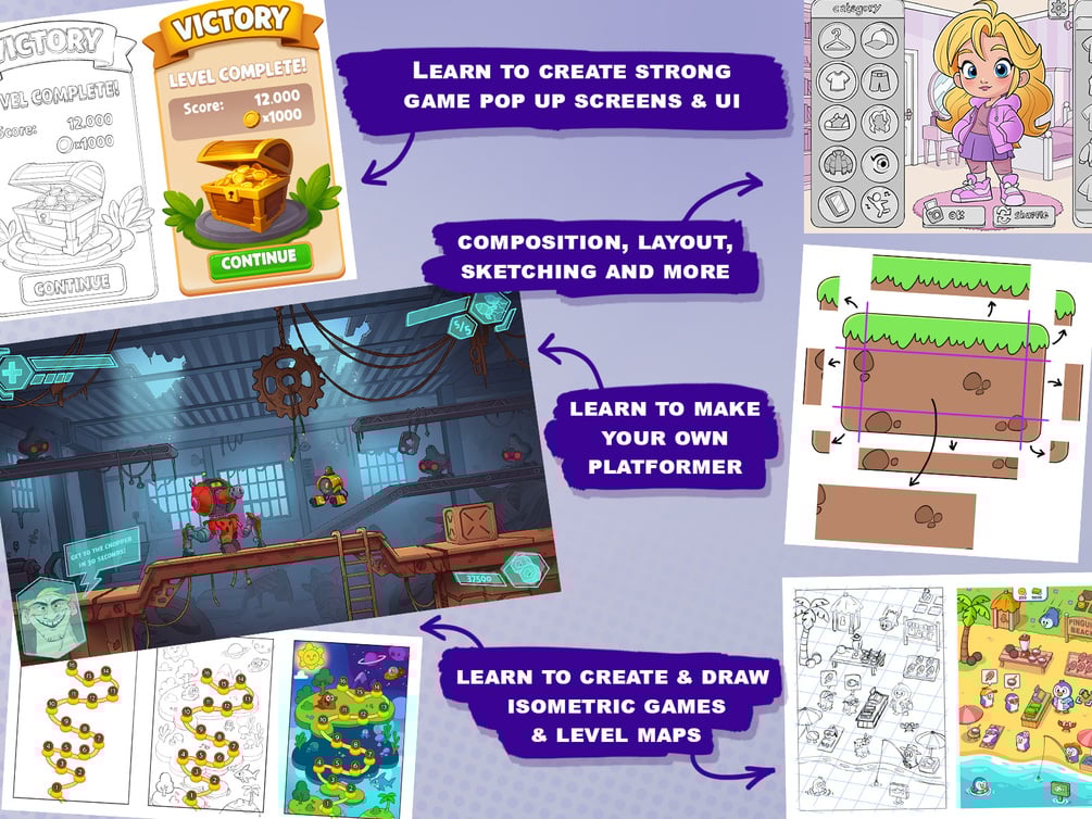 Learn to draw characters, worlds, UI, and full game screens, step by step.