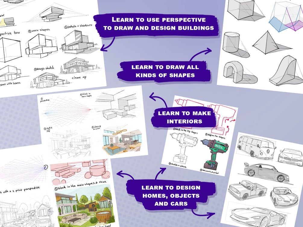 The video tutorials guide you step-by-step through the drawing process, from rough construction lines to clean illustrations and color. Youβll follow along with the same scenes and projects shown in the eBook, including houses, interiors, product sketches, and urban designs.