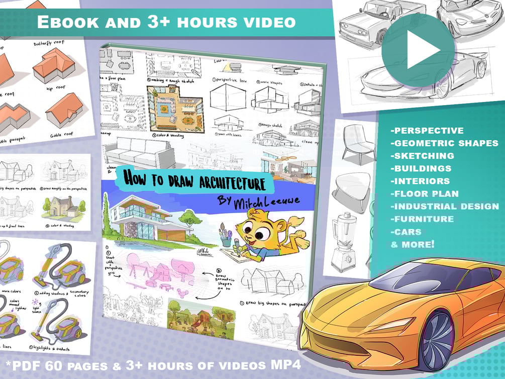The video tutorials guide you step-by-step through the drawing process, from rough construction lines to clean illustrations and color. Youβll follow along with the same scenes and projects shown in the eBook, including houses, interiors, product sketches, and urban designs.